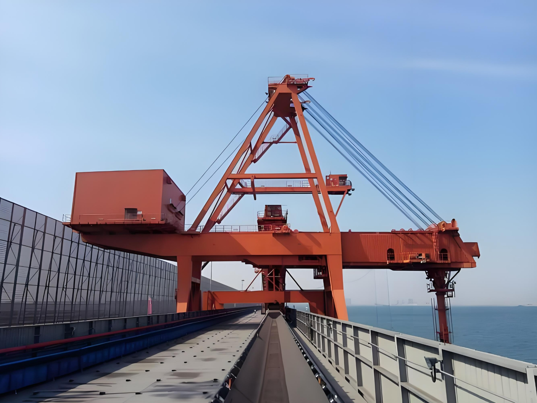 大型橋式抓斗卸船機(jī)是用來將固態(tài)散裝貨物從船艙運(yùn)至碼頭上的煤料傳送帶上的大型設(shè)備。